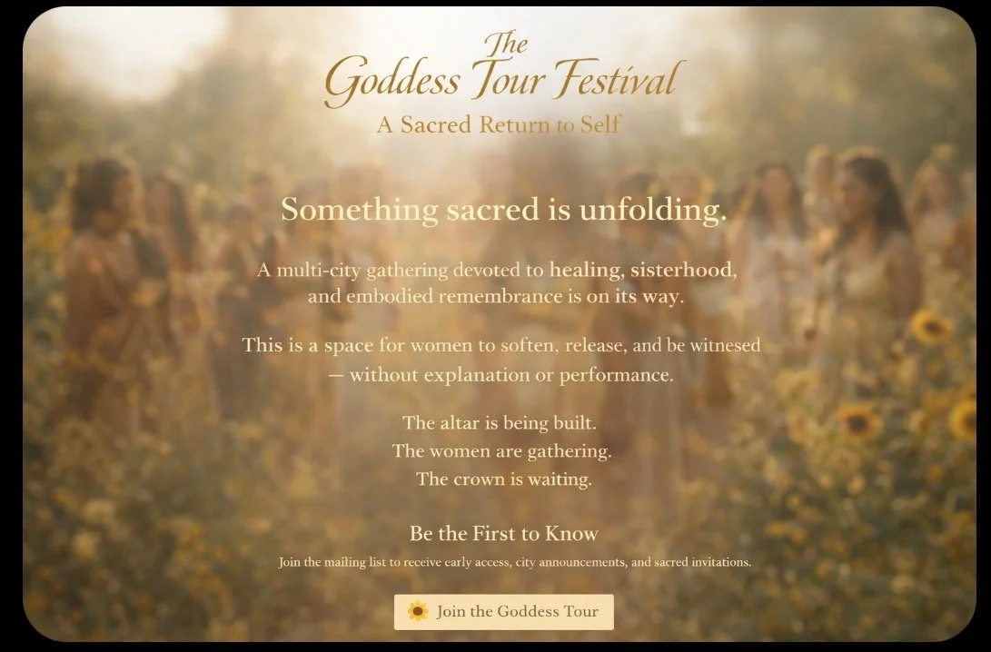 The Goddess Tour Festival is a sacred, traveling gathering devoted to the healing, embodiment, and remembrance of women.